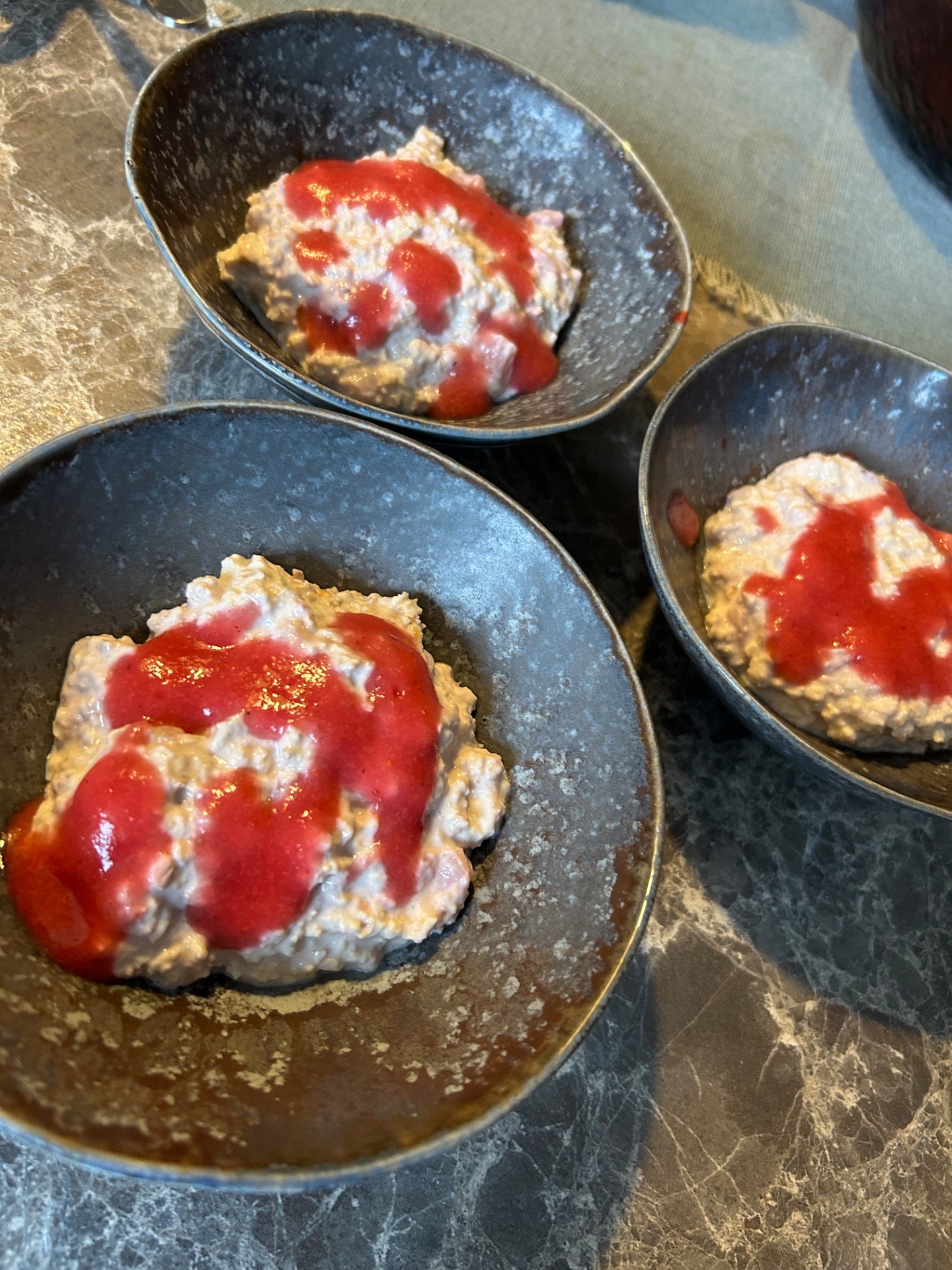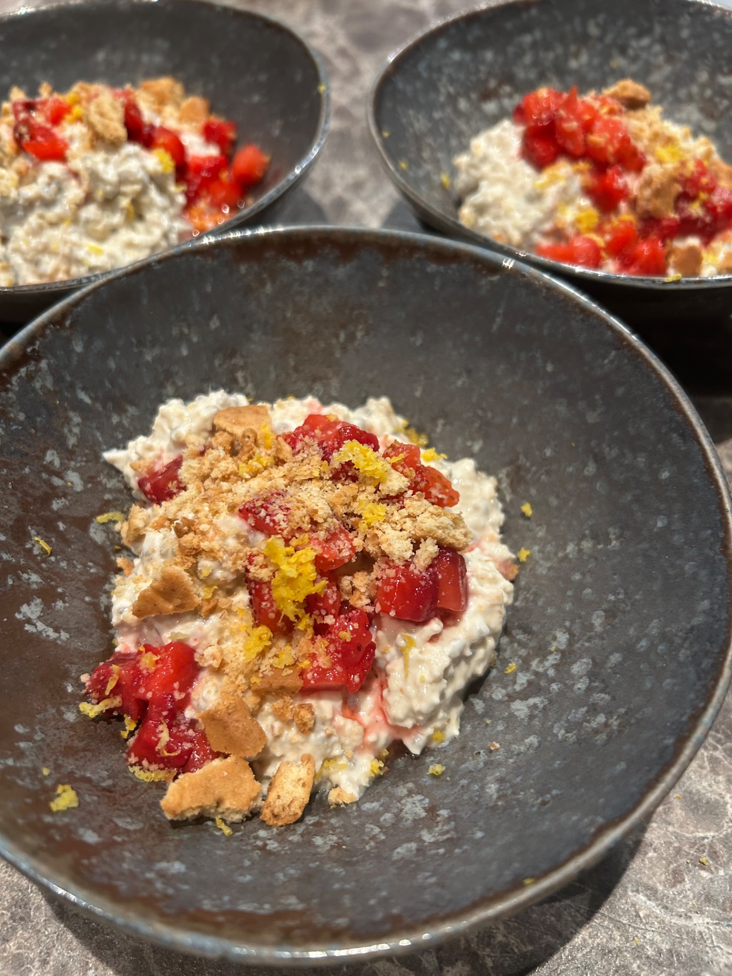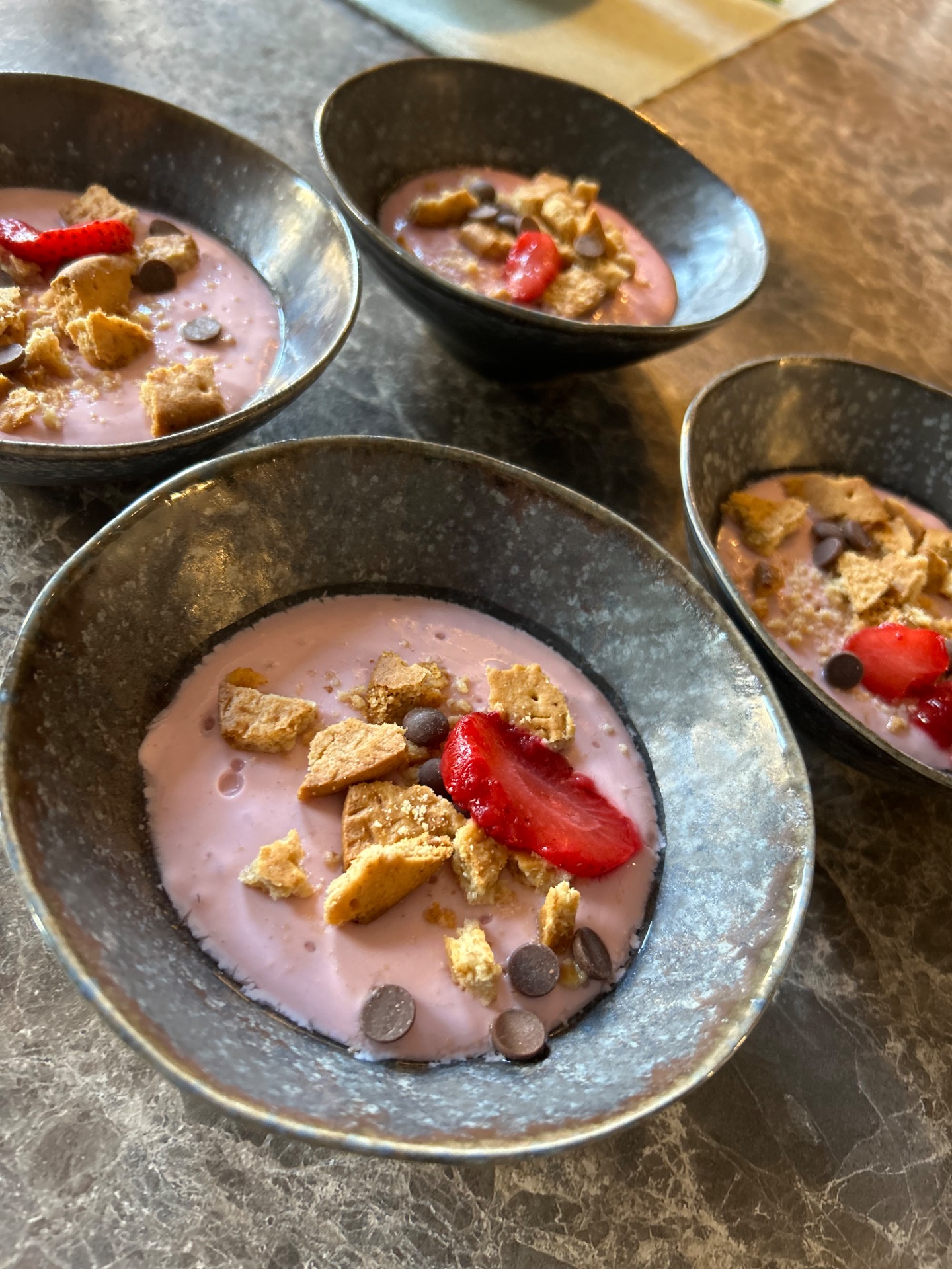 - Mixa jordgubbarna till toppingen och ringla lite över alla portionerna.