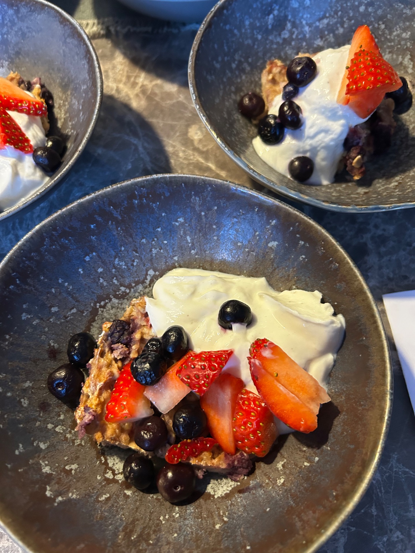 Mosa bananerna och blanda i resten av ingredienserna. Häll smeten i en ugnsform med bakplåtspapper i. Grädda i ca 20 minuter i 180 grader. Toppa med mer blåbär, jordgubbar och en klick vaniljkvarg. Dela upp kakan i 6 bitar.