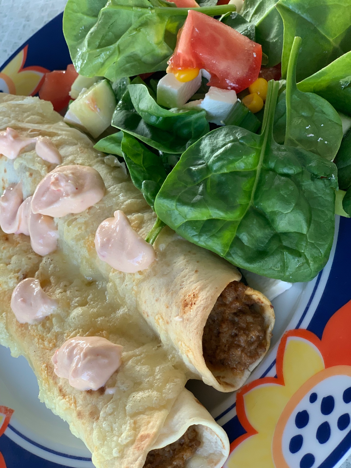 Klicka ut färs (ca 75 gram på varje) på två medium tortillabröd och rulla ihop dessa. Placera bröden med öppningen nedåt i en uppvärmd airfryer (180-200 grader) eller i en ungsform och strö över mager riven ost. Kör igång airfryern eller ställ in i ugnen på 225 grader tills de fått lite färg.