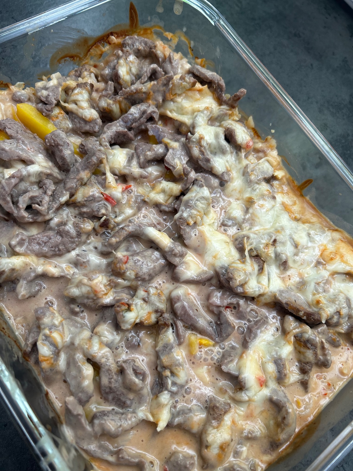 Lägg det kokta riset i en ugnsform och häll på paprika och lövbiff
