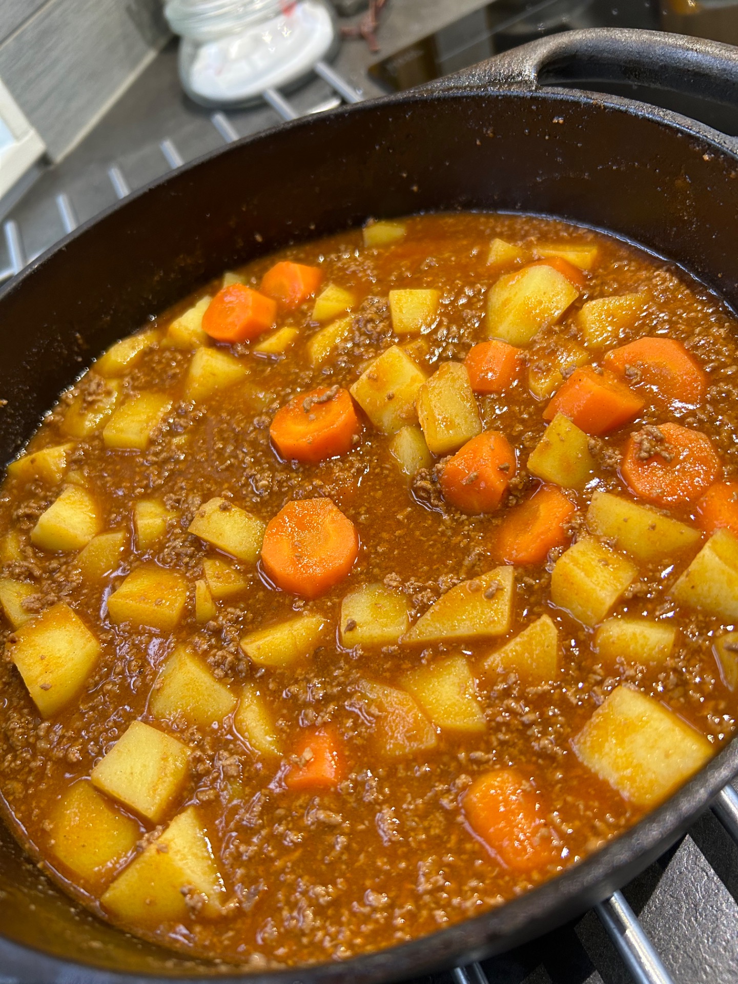 - Häll i vatten, smula ner buljongtärningarna, salt, potatis och morötter.